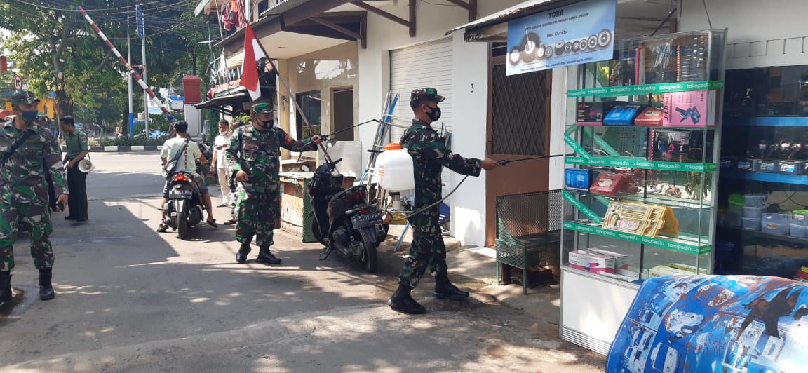 Jakarta, Babinsa Koramil 02 Sawah Besar, Sertu Marbun , Sertu Siswantoro dan Serda Heru Tri P yang juga Babinsa Kelurahan Mangga Dua Selatan melakukan sterilisasi wilayah untuk mengantisipasi kasus penularan covid 19.