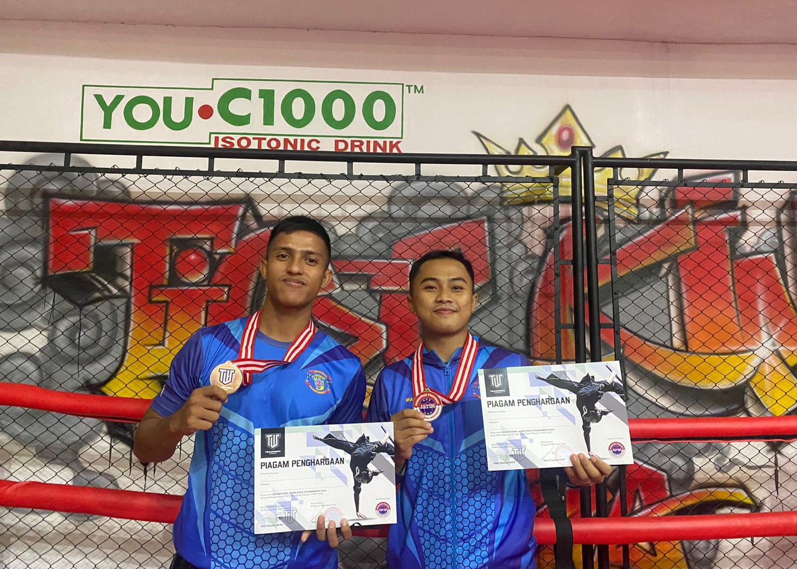 Malang. Prajurit petarung Serda Marinir Wahyu Supriadi dan Prada Marinir Abdul Rochim anggota Batalyon Kapa 2 Marinir Pasmar 2 berhasil meraih juara 1 pada kejuaraan Kickboxing Open Tournament Provinsi Jawa Timur yang diselenggarakan di Gedung Tiger King Camp, Malang. Senin (16/05/2022). Malam.