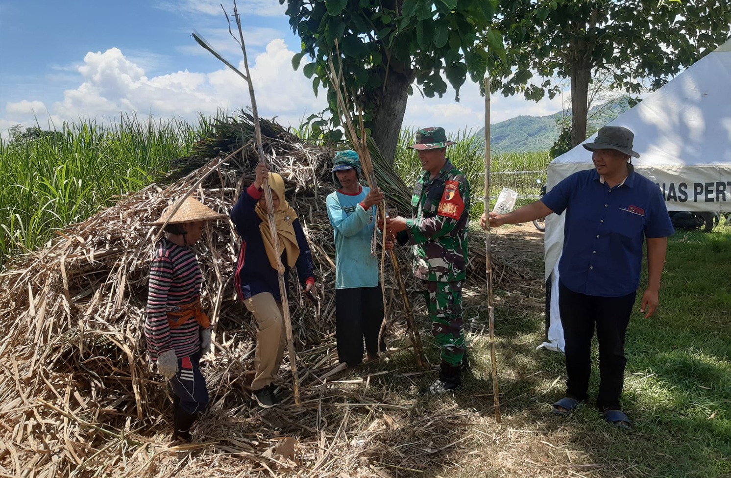 Suasana Desa Sumbergayam pagi itu tampak lebih ramai dari hari-hari biasanya. Truk bantuan milik Dinas Pertanian dan Pangan (Dispertapan) Trenggalek tiba di balai desa membawa ratusan ikat bibit tebu siap tanam. Warga bersama aparat TNI langsung bergerak menurunkan bantuan yang sudah dinantikan memasuki musim tanam. Kehadiran aparat teritorial memastikan proses distribusi berjalan lancar, tertib, dan tepat sasaran sesuai dengan rencana tanam yang telah disepakati bersama para petani.