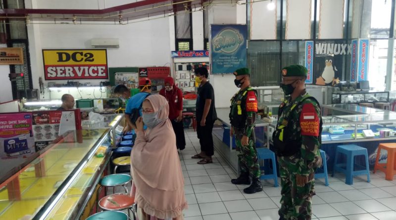 Madiun, Babinsa Koramil 0803/11 Geger, Kodim 0803/Madiun, Sertu Imam Maliki dan Serda Zainul Anwar melakukan sosialisasi New Normal dengan memberikan edukasi kepada pengunjung Mall Presiden Plaza Madiun.