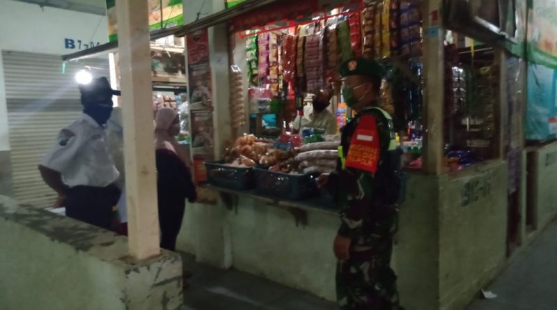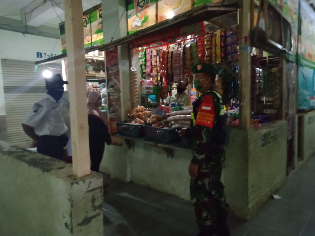 Usaha ini dalam rangka menekan penyebaran virus covid-19 di wilayah Kabupaten Madiun. Serda Agung dan Koptu Joko, Babinsa Koramil 0803/09 Saradan, Kodim 0803/Madiun melaksanakan kegiatan patroli di pasar Caruban Baru, Kecamatan Mejayan, Kabupaten Madiun, kegiatan ini sekaligus dimanfaatkan untuk memberikan imbauan kepada pengunjung dan penjual pasar agar mengikuti protokol kesehatan guna mencegah penyebaran Covid 19, Jumat (4/9/2020).