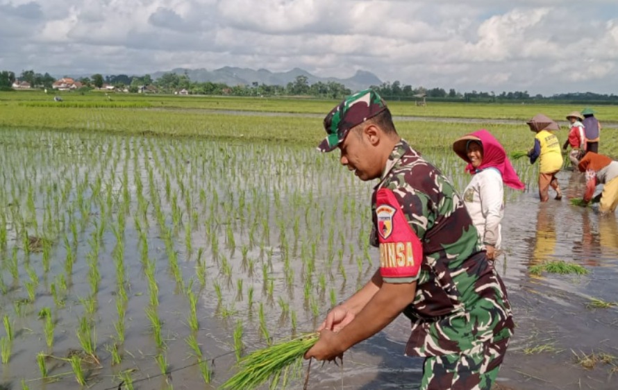 Babinsa Kromasan Turun Sawah, Dukung Petani Tanam Padi