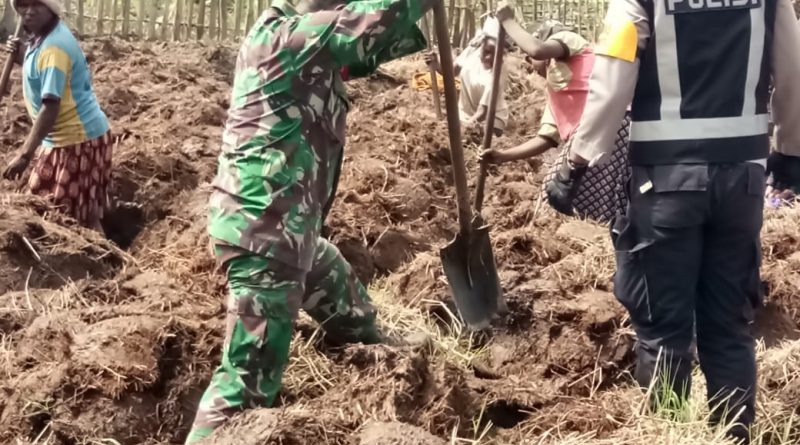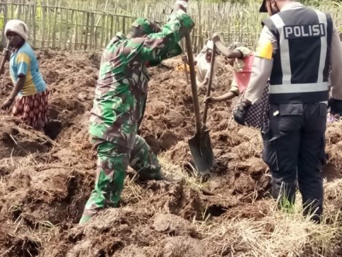 Ekadide – Dalam upaya mewujudkan kemanunggalan dengan rakyat, Babinsa Koramil 1703-04/Komopa bersama Babinkamtibmas melaksanakan karyabakti membantu masyarakat membuat lahan pertanian bertempat di Kampung Kagotadi Distrik Ekadide, Selasa (18/5/2021).