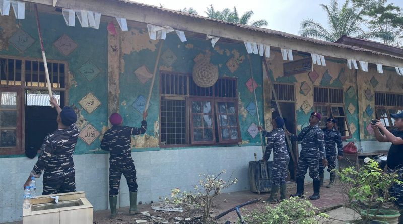 Aceh Tamiang, Prajurit Batalyon Infanteri 8 Marinir yang tergabung dalam Satuan Tugas (Satgas) Penanggulangan Bencana Kodaeral I melaksanakan aksi tanggap darurat dengan membantu membersihkan pembersihan sarana pendidikan di berbagai Sekolah Dasar di Aceh Tamiang, salah satunya di SDN 1 Tualang Cut Kec. Manyak Payed Kab. Aceh Tamiang. Aceh. Kegiatan ini difokuskan pada pembersihan material lumpur tebal serta tumpukan sampah yang terbawa arus ke dalam ruang kelas dan halaman sekolah. , (22/01).