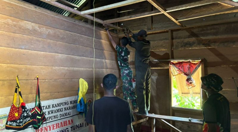 Timika – Dalam rangka memperingati HUT ke-80 TNI, Kodim 1710/Mimika kembali menggelar kegiatan Bakti Teritorial Prima TA 2025 dengan sasaran perbaikan rumah tidak layak huni milik bapak Kamaniel Waker di Kp. Damai, Distrik Kwamki Narama, Kab. Mimika, Jumat (26/09/2025). Perbaikan rumah tidak layak huni ini merupakan wujud nyata kepedulian TNI dalam hal ini Kodim 1710/Mimika terhadap peningkatan kesejahteraan masyarakat, khususnya bagi warga kurang mampu di wilayah binaan.