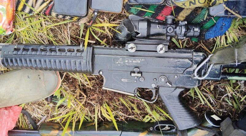 Dari lokasi kejadian, Prajurit TNI berhasil mengamankan sejumlah barang bukti diantaranya 1 pucuk senjata api jenis SS2 V4 dengan nomor senjata BF.CS 024739 beserta teleskop Trijicon SN: 923632, yang diketahui merupakan milik anggota TNI yang gugur pada tahun 2019 di sektor Ugimba, 1 pucuk senapan angin, 3 buah magazen (2 magazen M16 dan 1 magazen SS), 64 butir munisi kaliber 5,56 mm, 4 unit handphone, 1 buah dompet, 2 power bank, 1 buah emas, 1 senter kepala, Alat dan perlengkapan lainnya (kapak, parang, ketapel, korek api), Dokumen pribadi/KTP dan uang tunai jutaan rupiah, 2 buah noken dan 1 buah tas selempang.