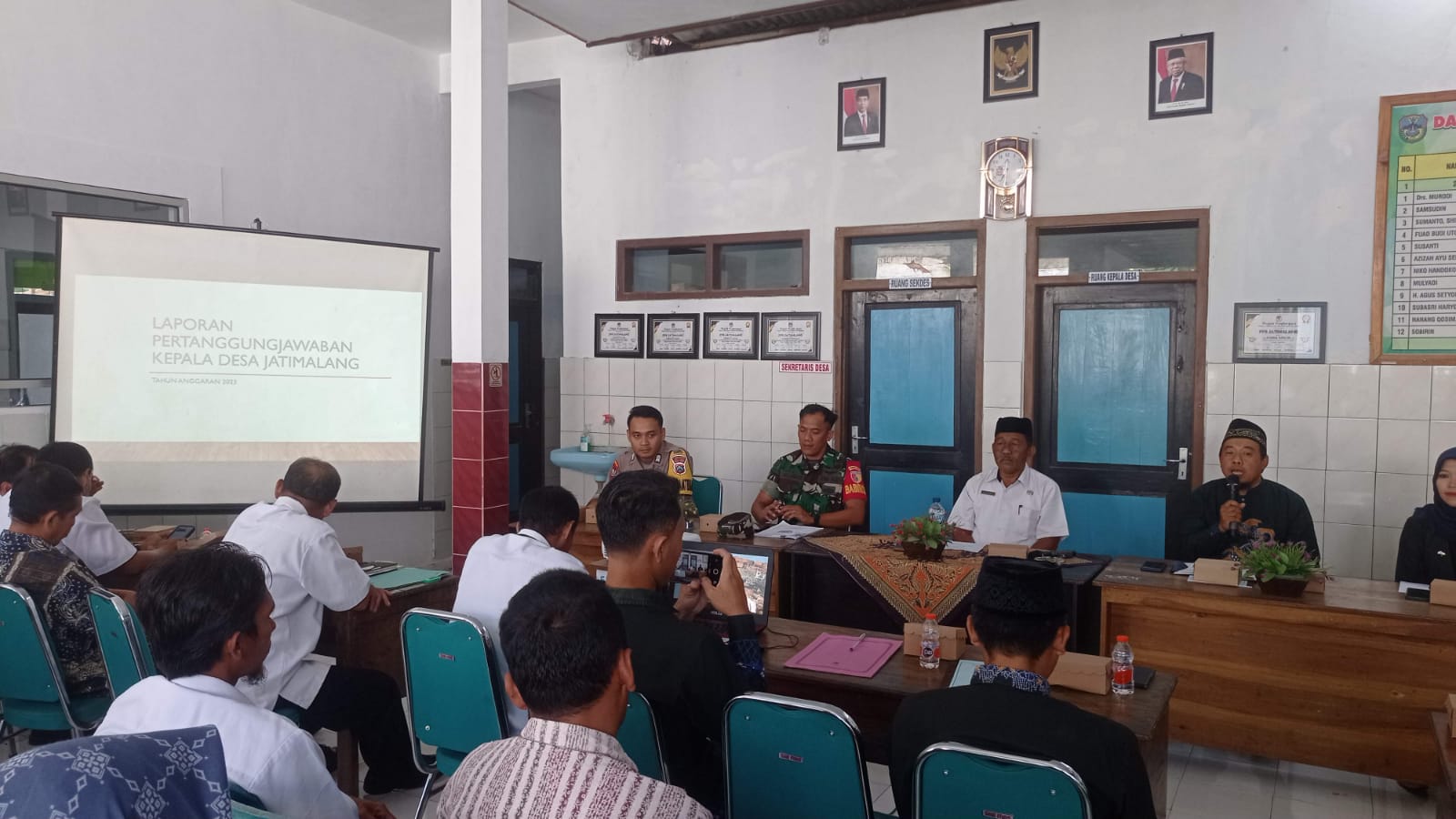 Tampak hadir dalam forum tersebut diantaranya, Kepala desa (Bpk.Drs.Murodi), Babinsa Koramil 0801/03 Arjosari (Serda Sujoko), Bhabinkamtibmas, (Bripka Bayu candra), Ketua BPD (Bpk.Tomi), Perangkat Desa, serta Tokoh masyarakat Desa Jatimalang.