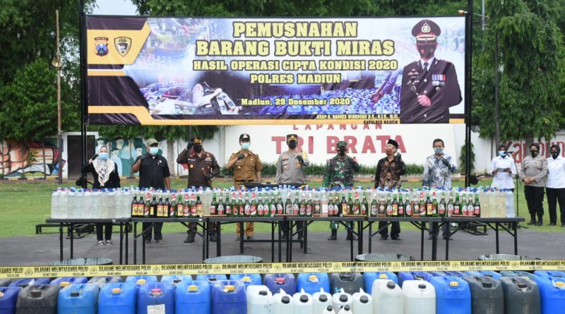 Madiun, Komandan Kodim 0803/Madiun menghadiri pemusnahan barang bukti minuman keras, pil koplo dan knalpot brong yang dilaksanakan di halaman Mapolres Madiun, Jawa timur, Selasa (29/12/2020).