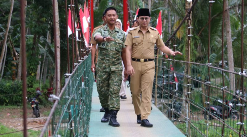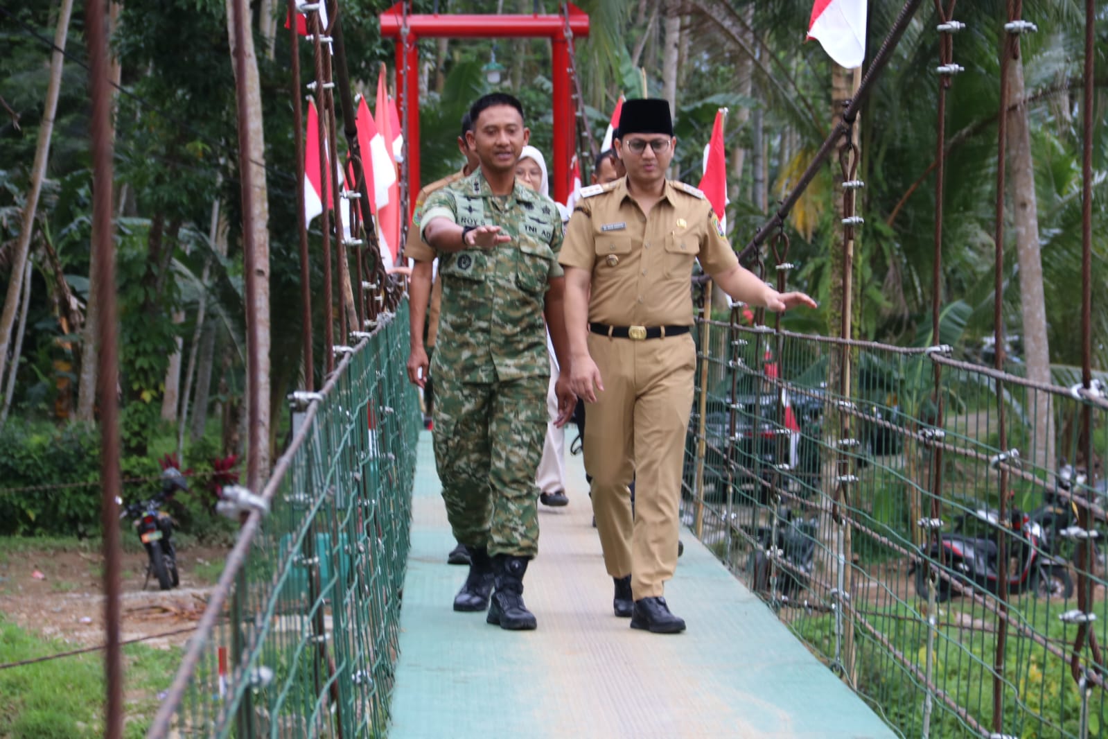 Usai mengikuti video conference, Dandim bersama Bupati Trenggalek meninjau langsung jembatan yang telah selesai dibangun dengan berjalan menyeberangi Jembatan Garuda Merah Putih. Keduanya juga menyempatkan diri menyapa warga serta para pelajar yang turut hadir dan menyambut gembira kehadiran jembatan yang selama ini dinantikan masyarakat.