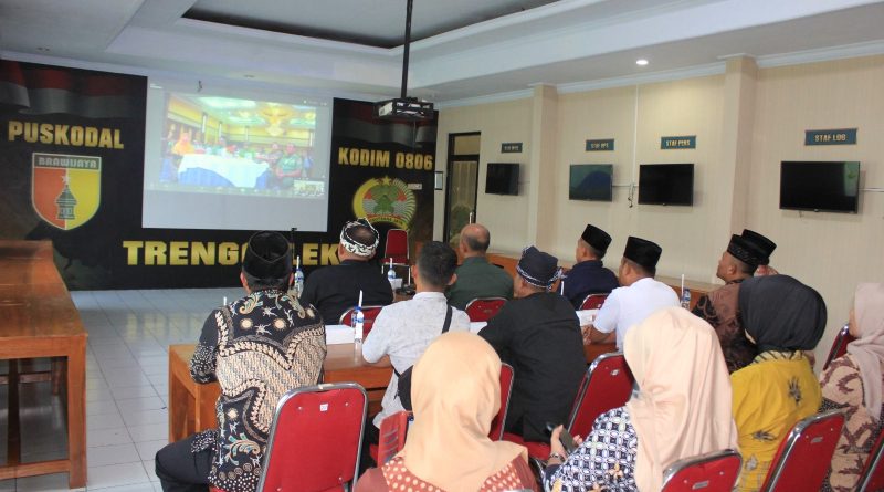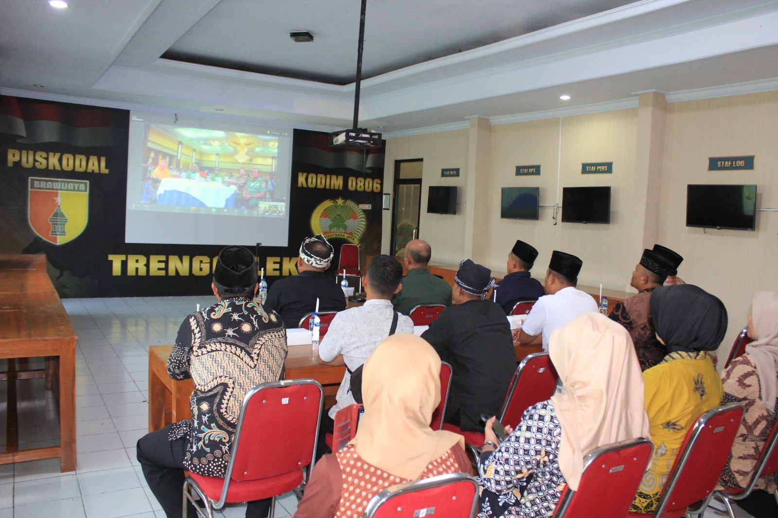 Kegiatan vidcon dilaksanakan di Ruang Vidcon Makodim 0806/Trenggalek dan diikuti langsung oleh Komandan Kodim 0806/Trenggalek, Letkol Czi Yudo Aji Susanto, S.Sos., M.A., bersama para tokoh agama, tokoh masyarakat, aparatur desa, dan perwakilan organisasi kemasyarakatan di wilayah Trenggalek.