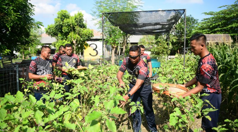 Surabaya. Komandan Batalyon Kendaraan Amfibi Pengangkut Artileri 2 Marinir (Danyonkapa 2 Mar) Letkol Mar Yalesesa Milwa Suga bersama seluruh prajuritnya melaksanakan panen raya di lahan ketahanan pangan Yonkapa 2 Mar, Ujung, Semampir, Surabaya. Rabu (01/04/26).