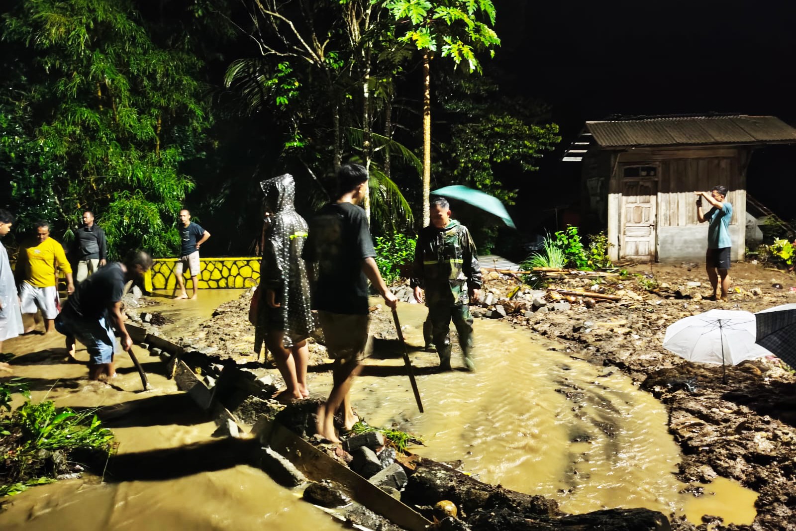 Aparat gabungan TNI-Polri bersama TRC PB dan warga setempat berjibaku membersihkan lumpur dan bebatuan yang menutup badan jalan. Pembersihan dilakukan secara manual menggunakan alat seadanya sebagai upaya percepatan pemulihan akses transportasi dan aktivitas masyarakat.