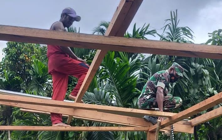 Supiori selatan, Babinsa Koramil 1708-04/Supiori Selatan, Sertu Semiy Uhing dan Serka Falentinus T. Warfaandu Melaksanakan kegiatan gotong royong membangun rumah warga di wilayah binaannya di Desa Maryadori Kecamatan, Supiori selatan Kabupaten Supiori, Senin, (14-02-2022).