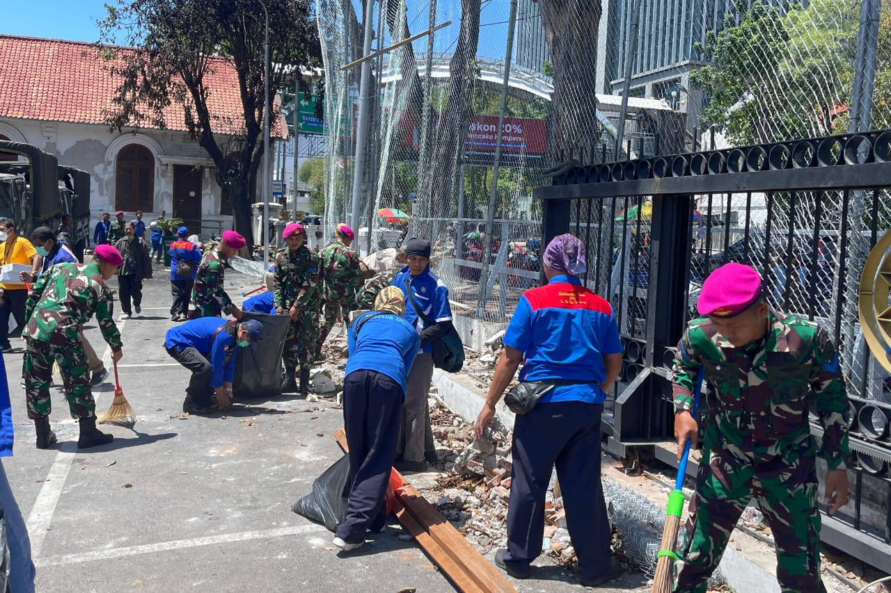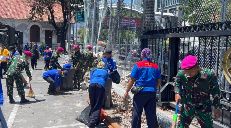 Surabaya. Pasca terjadinya demonstrasi yang menyebabkan kerusakan Gedung Negara Grahadi, Prajurit yang tergabung pengamanan melaksanakan kegiatan sosial dengan melakukan pembersihan lingkungan dan fasilitas umum yang terdampak di halaman Gedung Negara Grahadi, Jl. Gubernur Suryo, Kota Surabaya. Rabu (03/09/2025).