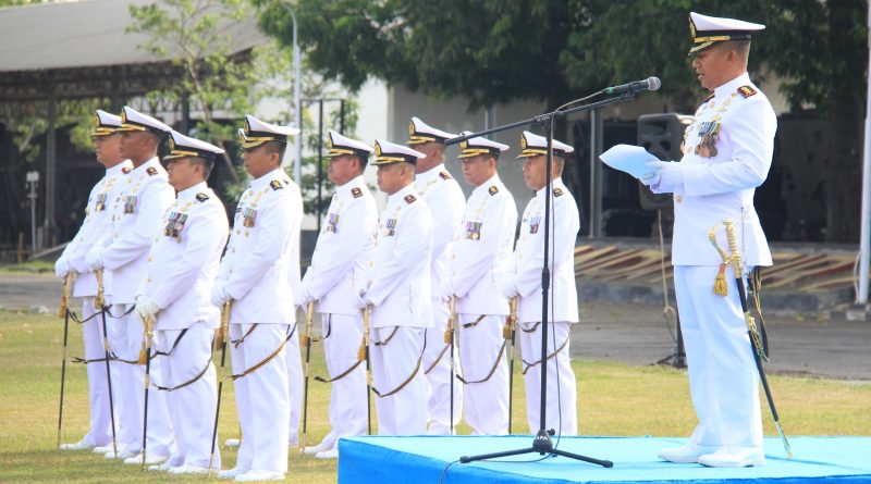 Surabaya. Komandan Resimen Kavaleri 2 Marinir Kolonel Marinir La Ode Jimmy Herizal Rachman, M.Tr.Hanla., M.M., bersama Prajurit, Jalasenastri Cabang 5 Korcab Pasmar 2 dan Pegawai Negeri Sipil melaksanakan upacara peringatan HUT Ke-80 TNI Angkatan Laut di Lapangan apel Mako Menkav 2 Mar, Kesatrian Marinir Soepraptono Semarung, Ujung Surabaya. (10/09).