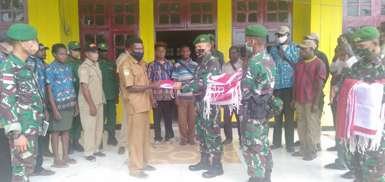 Merauke, Untuk memupuk dan meningkatkan rasa nasionalisme serta cinta terhadap Negara Kesatuan Republik Indonesia, khususnya yang ada di wilayah perbatasan RI-PNG, Satgas Pamtas Yonif 125/Simbisa membagikan bendera Merah Putih kepada warga Kampung Yanggandur, Distrik Sota, Kabupaten Merauke, Papua.
