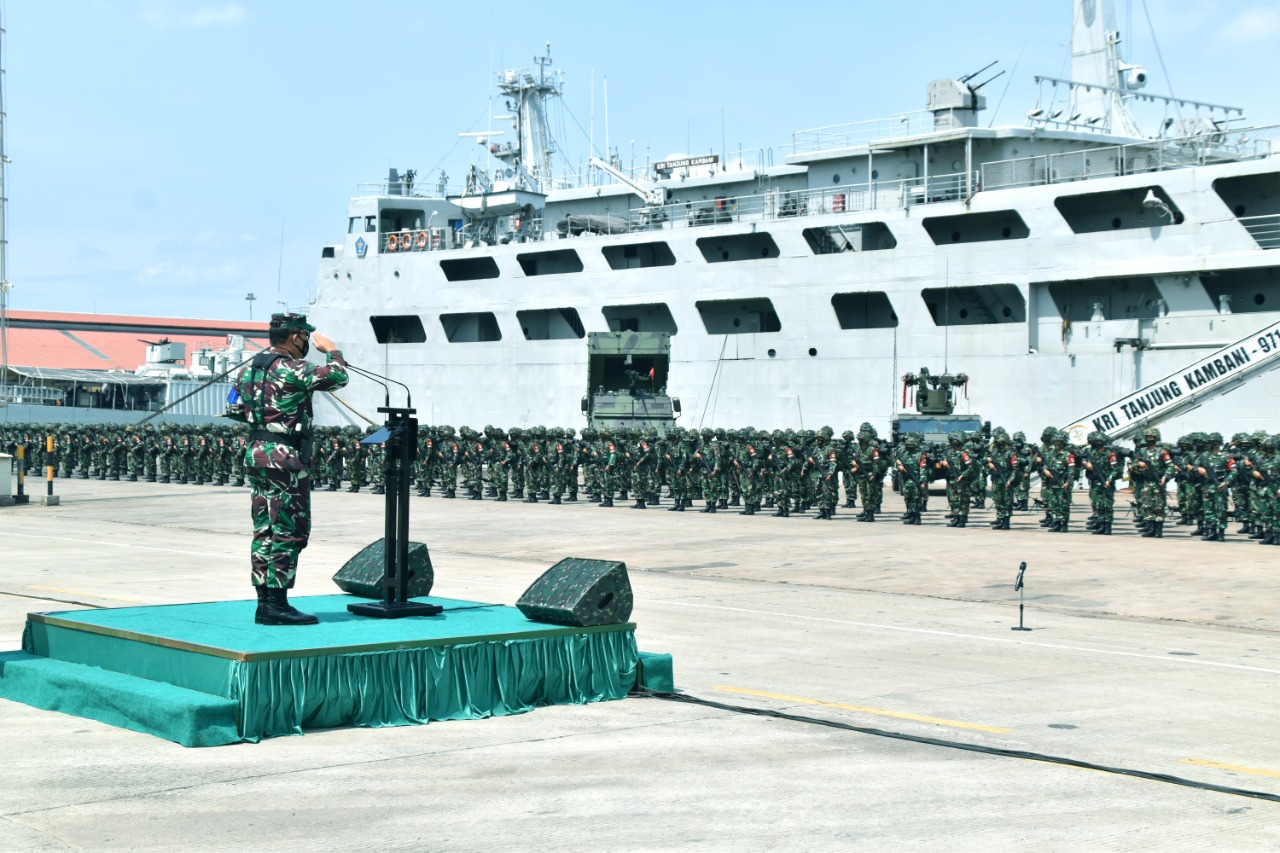 Lampung. Bertempat di Terminal Roro 2, Pelabuhan Panjang, Lampung, Selasa (10/11/2020) berlangsung Upacara Pemeriksaan Debarkasi Pasukan Satgasrat Brigif Raider-9/DY/2 Kostrad pada Latihan Antar Kecabangan (Ancab) TNI AD TA 2020, dengan Inspektur Upacara Komandan Kodiklat TNI AD Letjen TNI A. M. Putranto, S. Sos.