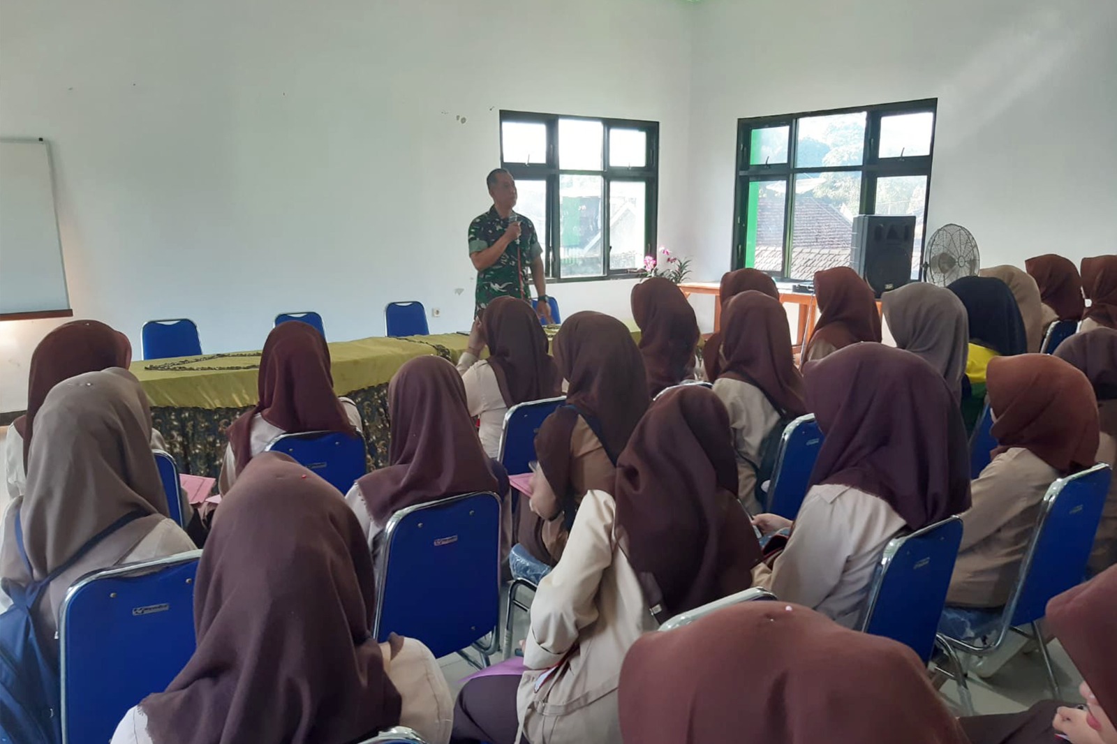Dengan senyum ramah, Kapten Wawan membuka sesi Wawasan Kebangsaan (Wasbang). Tidak ada kesan kaku. Ia mengawali dengan cerita ringan tentang pengalaman hidup sebagai prajurit TNI, lalu menyelipkan nilai-nilai cinta tanah air di dalamnya. Gaya bicaranya membuat para siswa tidak merasa sedang digurui, melainkan seperti mendengar kisah dari seorang kakak yang penuh pengalaman.
