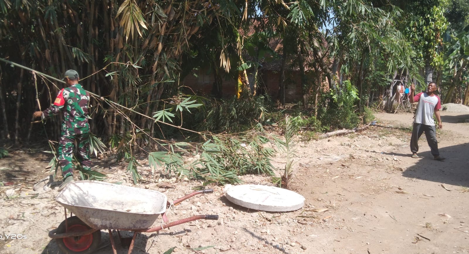 ” Hari ini salah satu kegiatan kami di wilayah desa binaan yaitu kerja bakti membersihkan atau memangkas pohon bambu yang selama ini mengganggu para pengguna jalan, ” ujar Sertu Abdul Rozy.