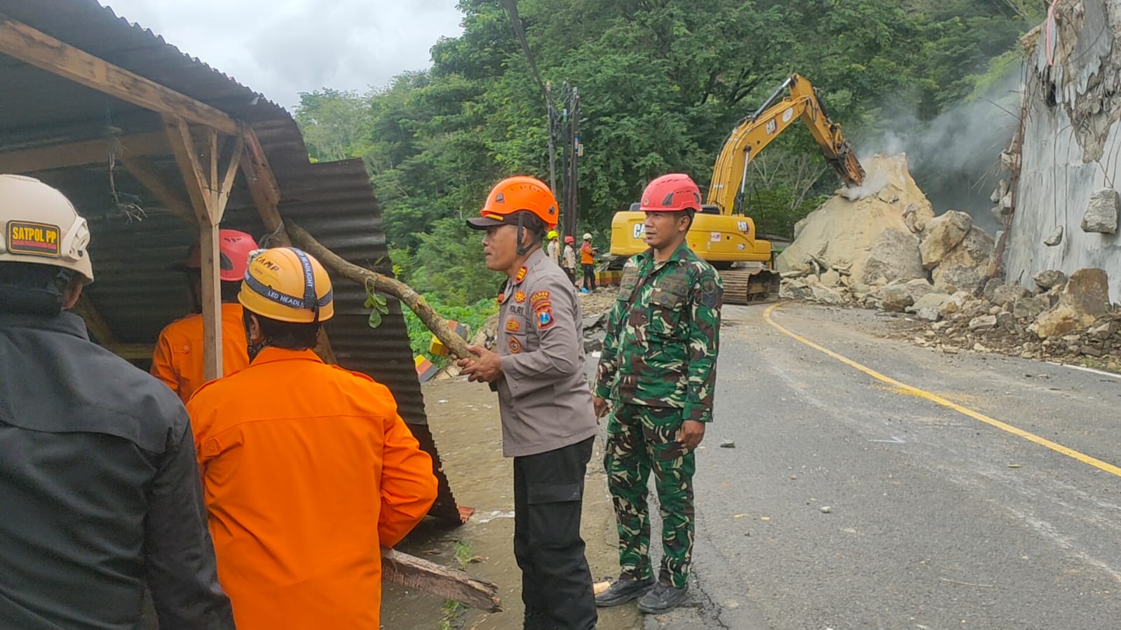 “Dua unit alat berat kami fokuskan pada material longsor berupa batu besar yang harus dihancurkan terlebih dahulu menggunakan breaker agar dapat dipindahkan dari badan jalan,” ujar Kapten Teguh saat meninjau proses penanganan di lokasi longsor.