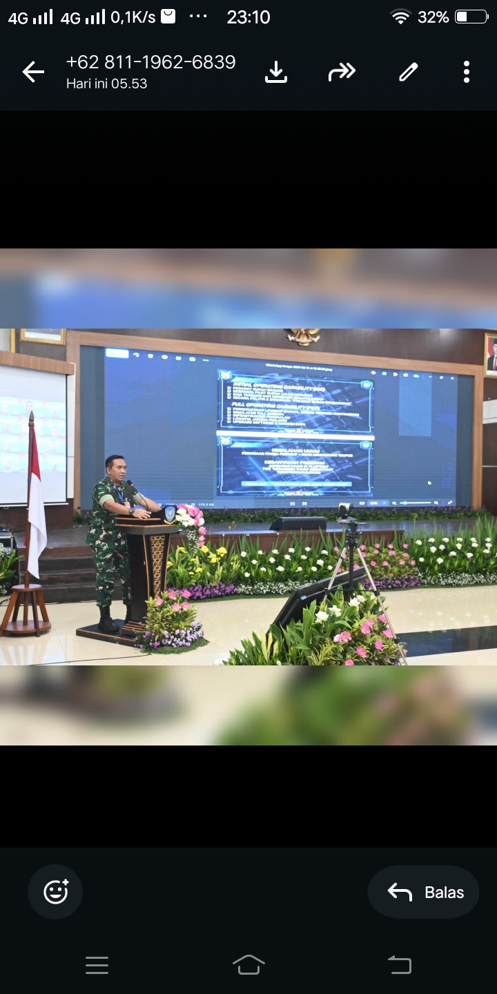 “Seiring dengan dinamika kebijakan sentralisasi anggaran dan pelaksanaan Harwat Alpahankam, maka diperlukan kesamaan pemahaman, pola pikir, pola sikap, dan pola tindak seluruh pemangku kepetingan, sehingga tercipta keselarasan dalam menjamin tercapainya tingkat kesiapan operasional dan _Full Operational Capability_ (FOC) Alpalhankam TNI AU”, ujar Kaskoopsudnas.