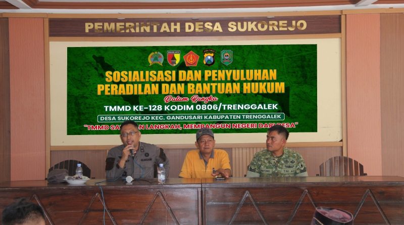 Trenggalek – Satuan Tugas (Satgas) TNI Manunggal Membangun Desa (TMMD) ke-128 Kodim 0806/Trenggalek terus memperkuat sinergi lintas instansi dalam menggugah masyarakat agar melek hukum. Kali ini, Satgas TMMD menggandeng Kejaksaan Negeri (Kejari) Trenggalek untuk menggelar Sosialisasi Peradilan dan Bantuan Hukum.