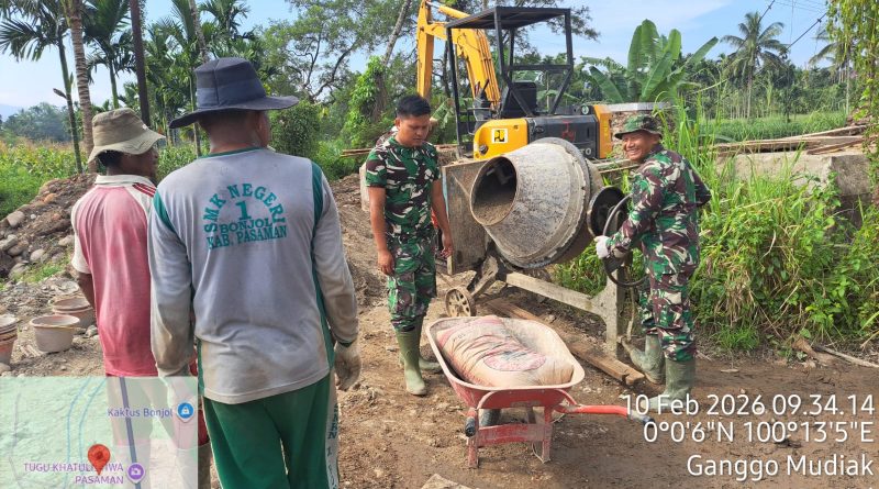 Pasaman – TNI Angkatan Darat melalui Kodim 0305/Pasaman terus memacu pembangunan Jembatan Gantung Equator di Jorong Kampung Alai, Nagari Ganggo Mudik, Kecamatan Bonjol, Kabupaten Pasaman, Sumatera Barat, Selasa (10/2/2026). Pembangunan infrastruktur ini menjadi wujud nyata kemanunggalan TNI AD dengan rakyat dalam mendukung percepatan pembangunan wilayah pedesaan.